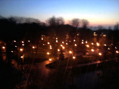 The hotel room where I was staying looked out on one end of Odessa’s pedestrian zone and a park with a pavilion. I decided to record from this hotel room window almost every night.