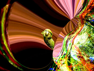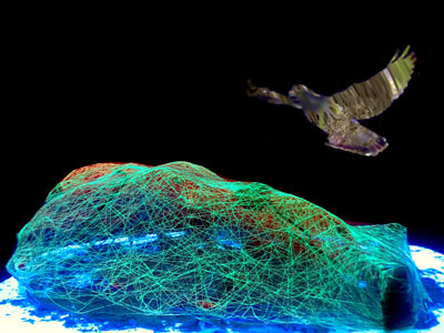 In Zealandia a world is simulated in a physical space – “Pricked and Away” simulates a virtual world. Markus Wintersberger and I created digital worlds using the original video and sound recordings from Zealandia, and with the help of VR goggles and headphones the narrator, Christian Reiner, immerses himself into these realms and is swept away to a place disconnected from the physical world. Sleeping Beauty pricks her finger on a spindle. This is an ancient symbol of life–death–life or the here and the hereafter, which could already be found in Plato’s “Politeia” (Republic) in the Immortality of the Soul (Book X) and the Myth of Er.